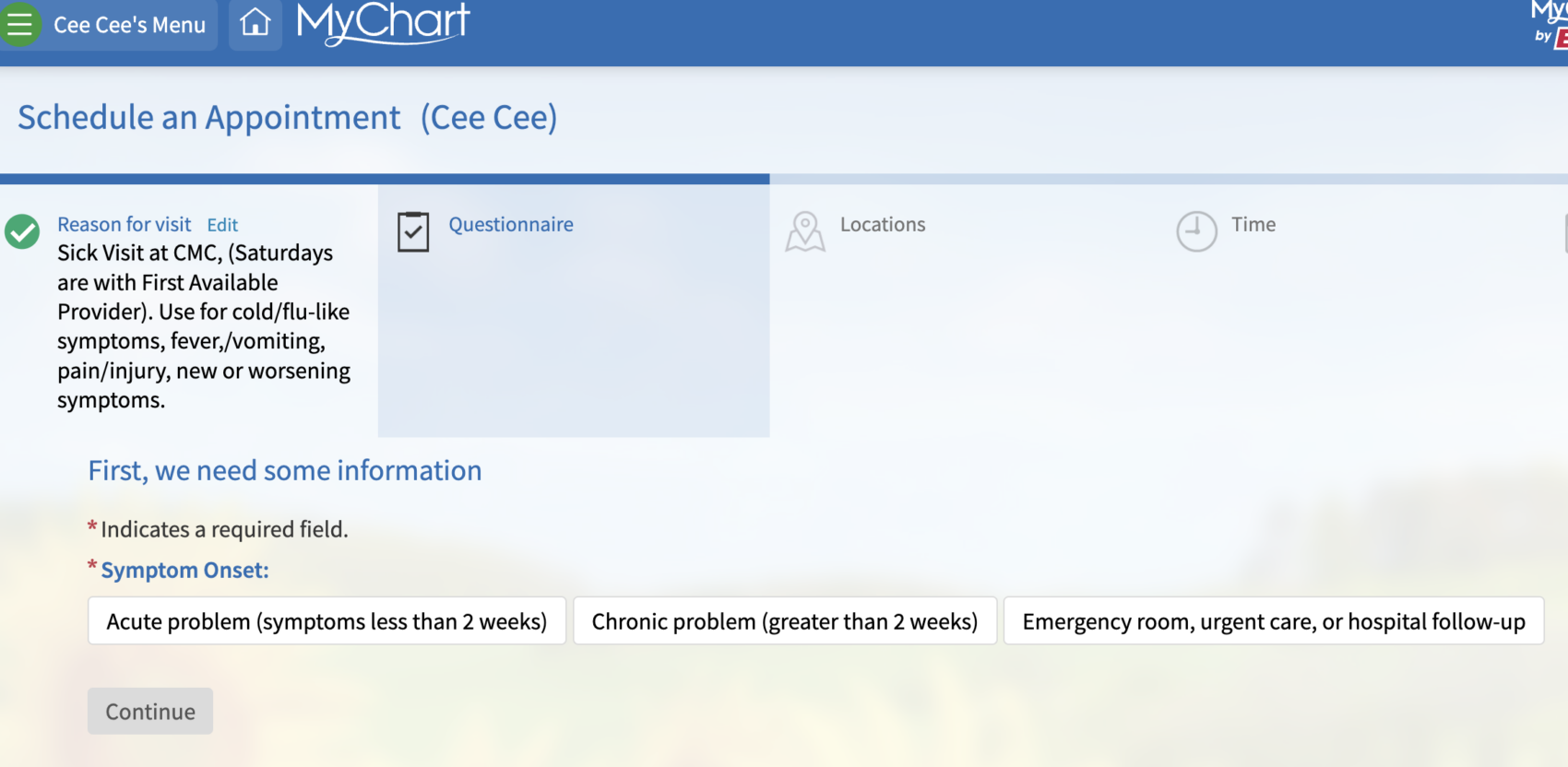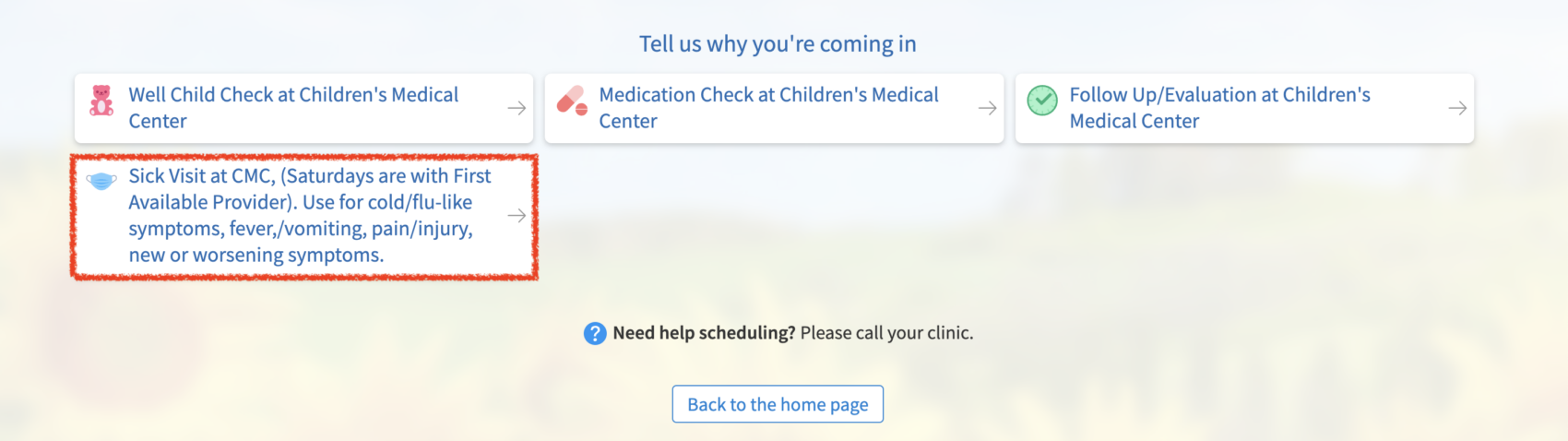 If you select to schedule a sick visit, you will then be presented with a list of symptoms that, if present, could indicate a more urgent scheduling need and you will be directed to call the office to speak to a nurse.